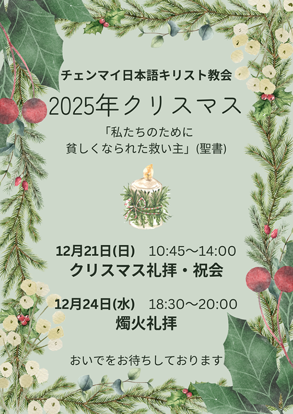 チェンマイ日本語キリスト教会は、タイの古都チェンマイ唯一の日本語教会です。チェンマイ在住邦人、ロングステイヤー、季節滞在者や留学生、旅行者の方々が集い、この世界とすべての生命をお造りになられた生けるまことの神さまを日本語で礼拝しています。聖書を知りたい、讃美歌を歌いたいという方、初めての方でも歓迎いたします。