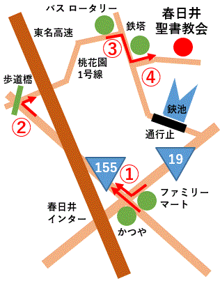迂回路例 (1)国道19号から国道155号小牧方面へ(高蔵寺方面からは直進) (2)高速道路のガードを越えたら、歩道橋のある交差点を鋭角に右折 ※右折レーンが無いためご注意願います (3)坂道を上りしばらく進み、突き当たりを右へ (4)左側に鉄塔が見えるため、鉄塔のすぐ奥を左折し直進すると教会が見えてきます |
