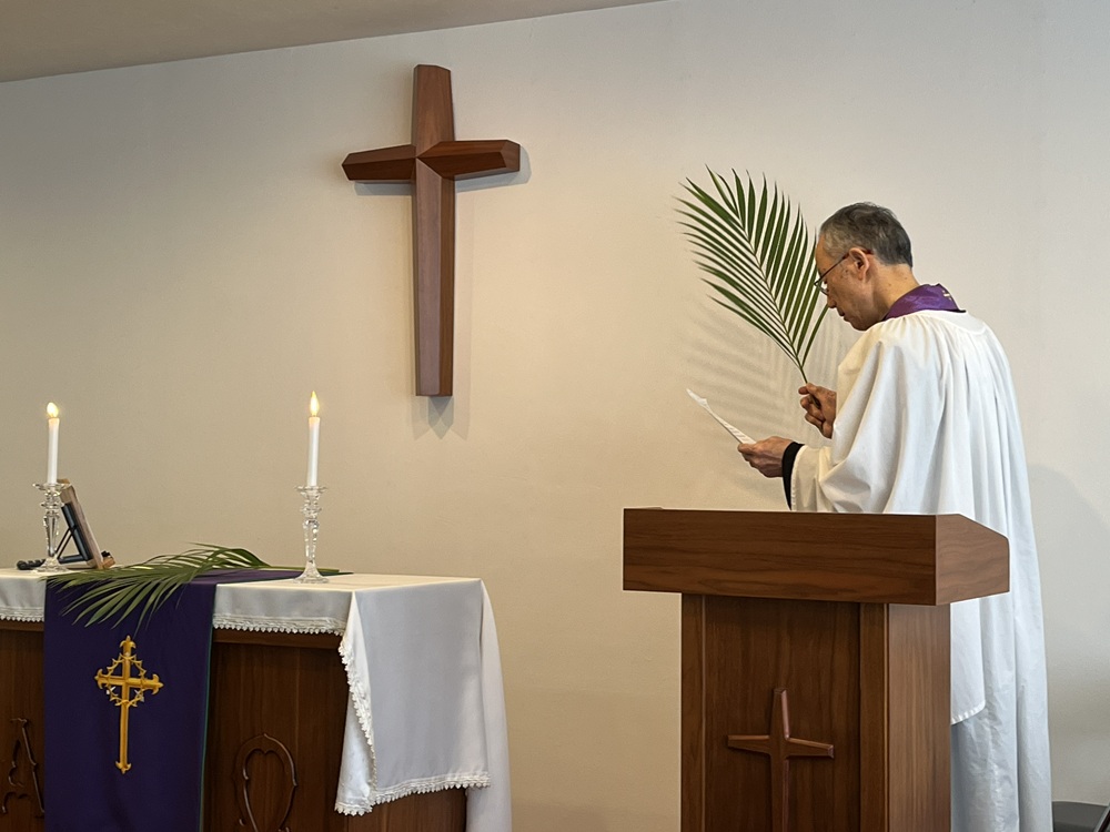 牧師は、創世記3章19節の「あなたは、顔に汗を流して糧を得、ついにはその大地に帰る。あなたはそこから取られたのだから。あなたは土のちりだから、土のちりに帰るのだ。」の御言葉に基づき、前年度の「灰の水曜日」に使用した棕櫚の葉の灰で作った墨を親指に付け、「人よ、あなたは塵から造られたから、塵に帰ることを忘れずにいなさい。」と言いながら、礼拝者の額に十字の印を付けました。