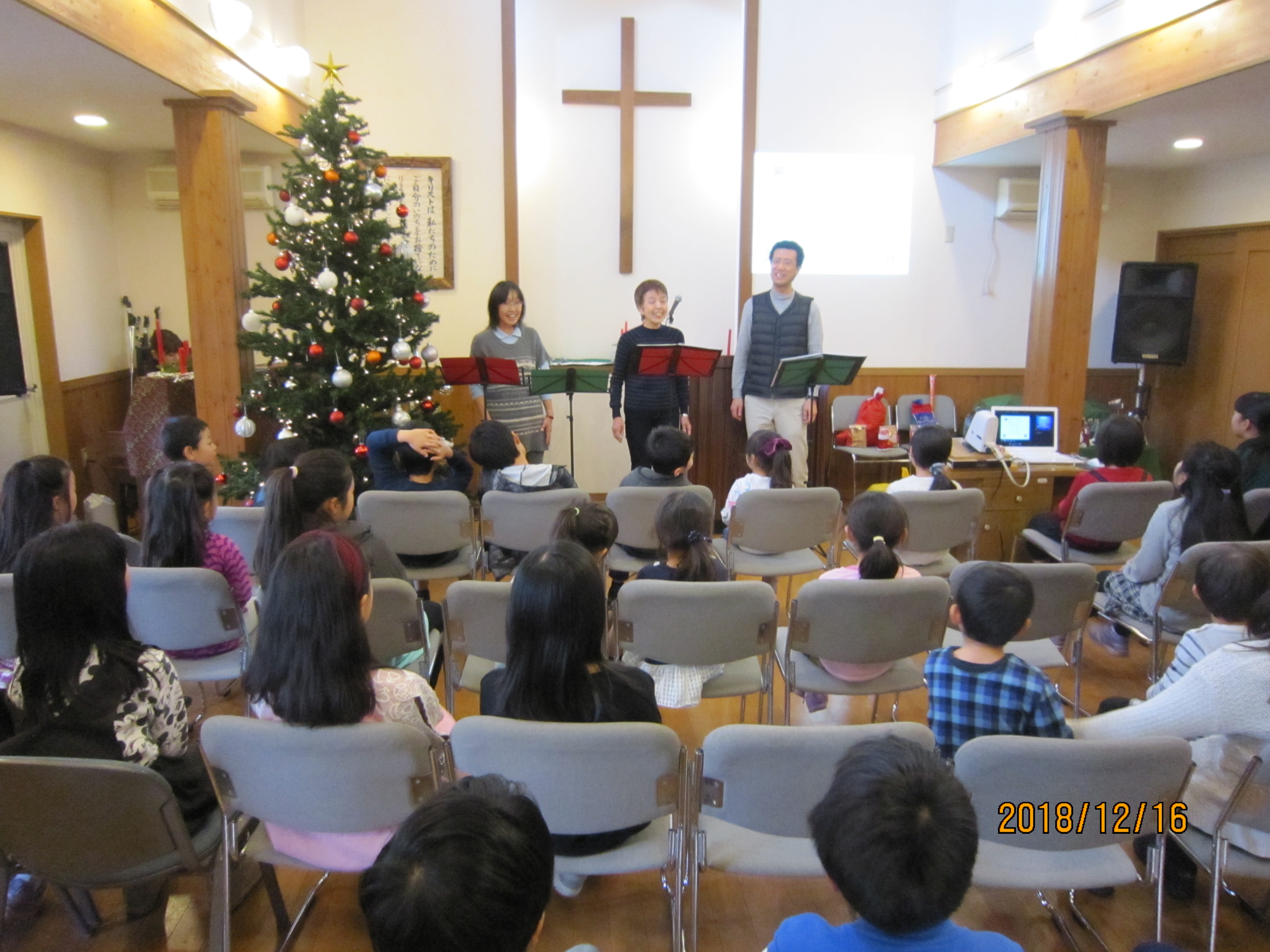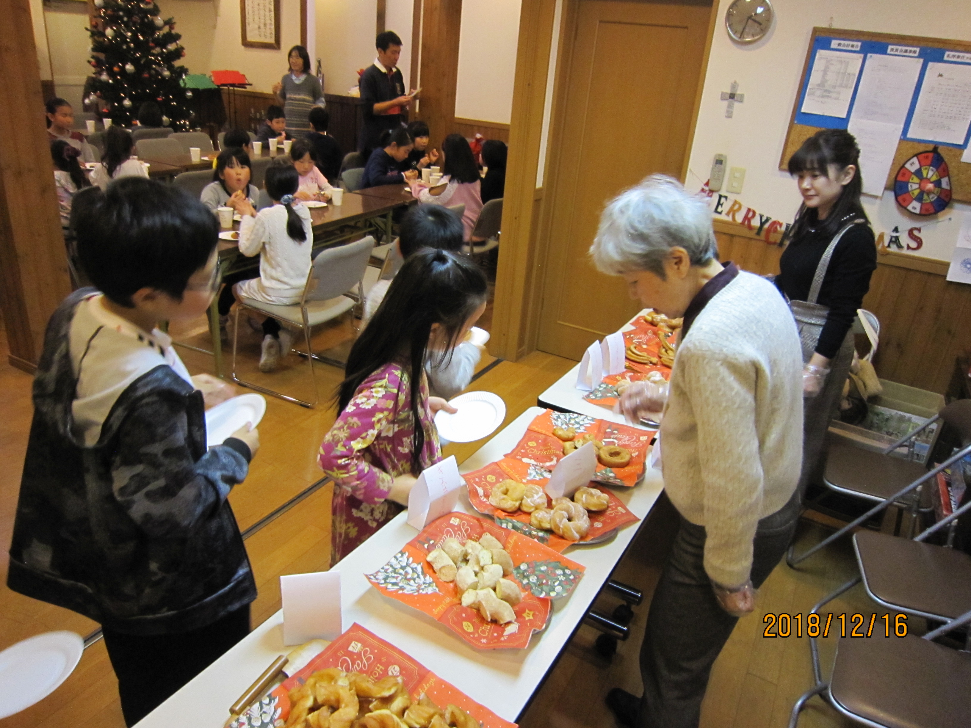 昨日の12月16日のクリスマス会のには、教会さんの予想をはるかに超える、たくさんのお友達が来てくれました。2歳の一番小さいお友だちから6年生の大きなお友だちまで計39人。椅子がぎっしり並んで、嬉しい悲鳴です!「ドーナツ足りるかなぁ???」