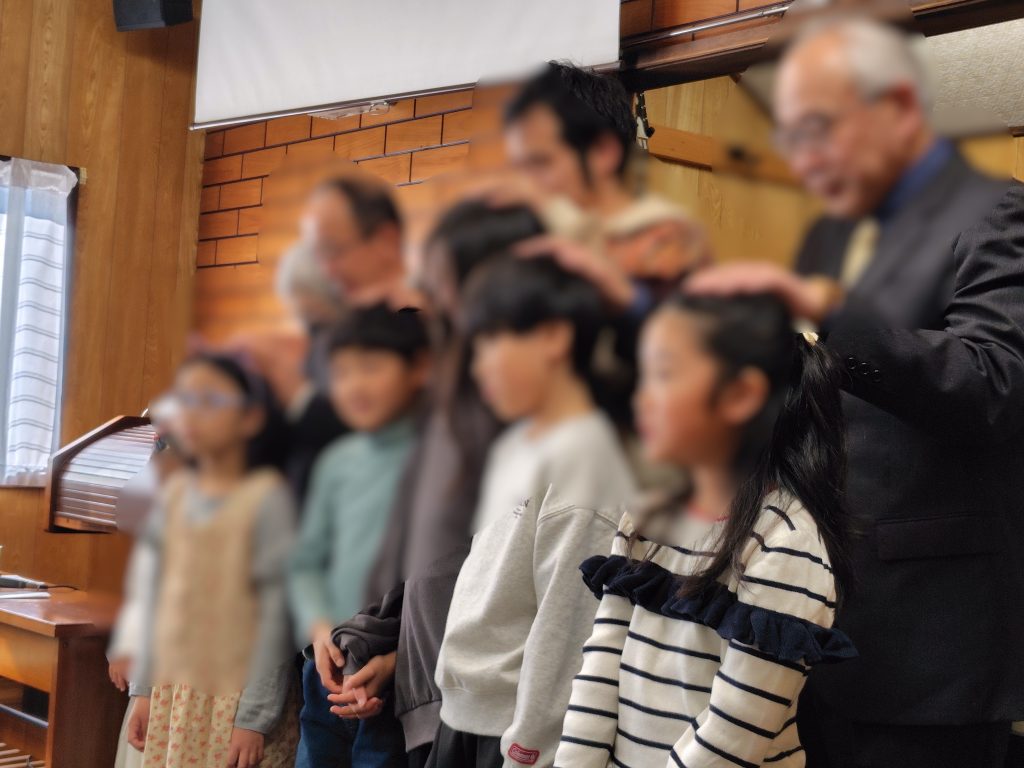 第2礼拝の中で「子ども祝福式」がありました。この日は、子どもたちは会堂の席の前の方に座り、お話しを聞きました。そして、会衆の皆様とともに、子どもたちの祝福を祈りました。