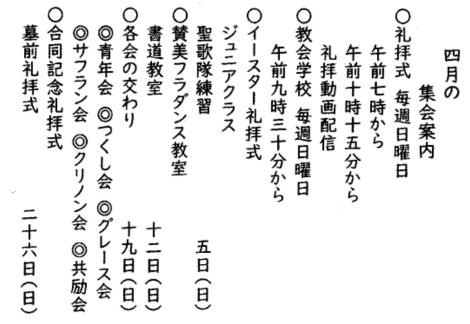 礼拝式は、7時早朝、10時15分の2回と、動画配信を行います。