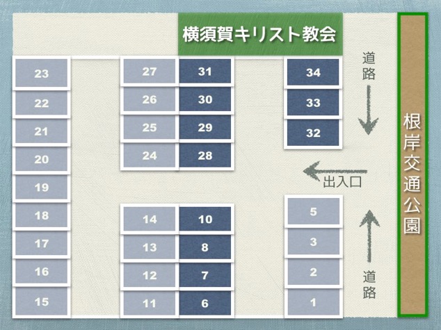 日曜日に駐車できるのは、6番〜10番、28番〜34番です。