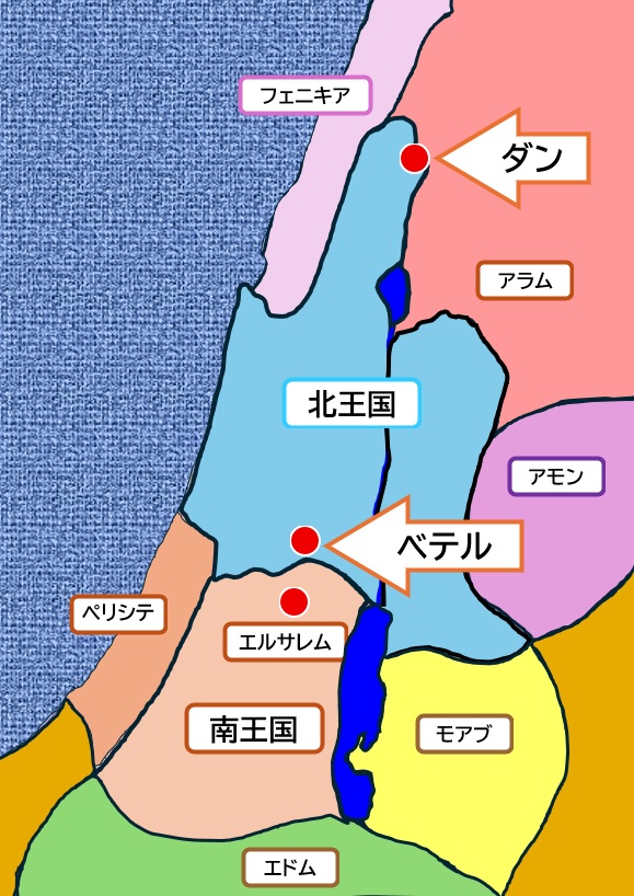 北王国の北の端のダンと、北王国の南の端のベテルに金の子牛の像を置いて