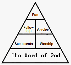 I made this chart, the Christian Food Pyramid. At the bottom is the foundation, the Bread of Life. The Bread of Life is the Word of God. This is as in the passage that says, "Man shall not live by bread alone, but by every word that proceeds from the mouth of God." The Bible is the foundation of the church. Jesus said we should build on this foundation. Mt. 7:24. "Therefore everyone who hears these words of mine and puts them into practice is like a wise man who built his house on the rock." And the content of that word is the law and gospel of God that points us to the salvation in Jesus Christ. Jesus said, "I am the bread of life." John 6:51. The next level in my chart has the sacraments and worship. The sacraments of baptism and the Lordfs Supper bring that promise of God in his word to us. The word brings us forgiveness. The word brings us eternal life. We celebrate this in worship. Worship is when we read the Bible and receive the forgiveness of sins. Worship is when we pray and praise. The next level is Christian love and fellowship and service. At the top I have put fun. There can be a lot of fun in the church.