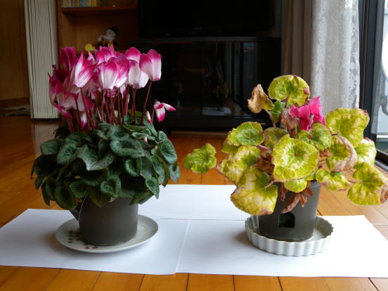 | 2015年3月5日「驚異のシクラメン」 右側のシクラメンが3日前に花が咲きました。昨年咲き終わったシクラメンに引き続き水をやり続けました。枯れそうになった葉っぱがそのまま生き続け再び花が咲きました。左側は2014年12月に頂いたものです。右側は2013年12月に頂いたものです。聖書「百歳の男((アブラハム)に子供が生まれるだろうか。90歳のサラに子供が生めるだろうか」(創世記17章17節)その後,サラに子供イサクが生まれました。このことを信じます。 |