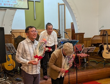 | 2025.8.10、横手では「音フェス」が開催された。 横手を元気に、楽しもう!と色々な音が流れた。 この営みに当教会は協賛し、礼拝賛美をゴスペ ルに変えて、若者の感性を理解しようと試みた。 皆さん協力してくださった。 また、礼拝の中で、一人の若者が洗礼を受けた。 イエス様を私の救い主と信じ、歩みだした。 天での大きな喜びに合わせて、礼拝後祝会が 持たれ、大きな喜びに満たされた。ハレルヤ! |