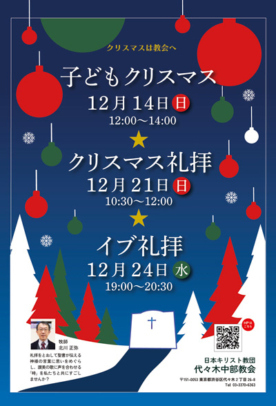 アドベント(待降節)第3聖日 説教 『間違いが用いられる』北川正弥牧師 聖書 イザヤ書45章1〜7節 ローマの信徒への手紙10章14〜21節 讃美 542、96、68、492、539 交読 詩篇 第130編 司式 岩崎洋介兄 奏楽 野口知子姉 献金祈祷 植田しげ子姉 受付 松本信也兄 三田信之兄 |